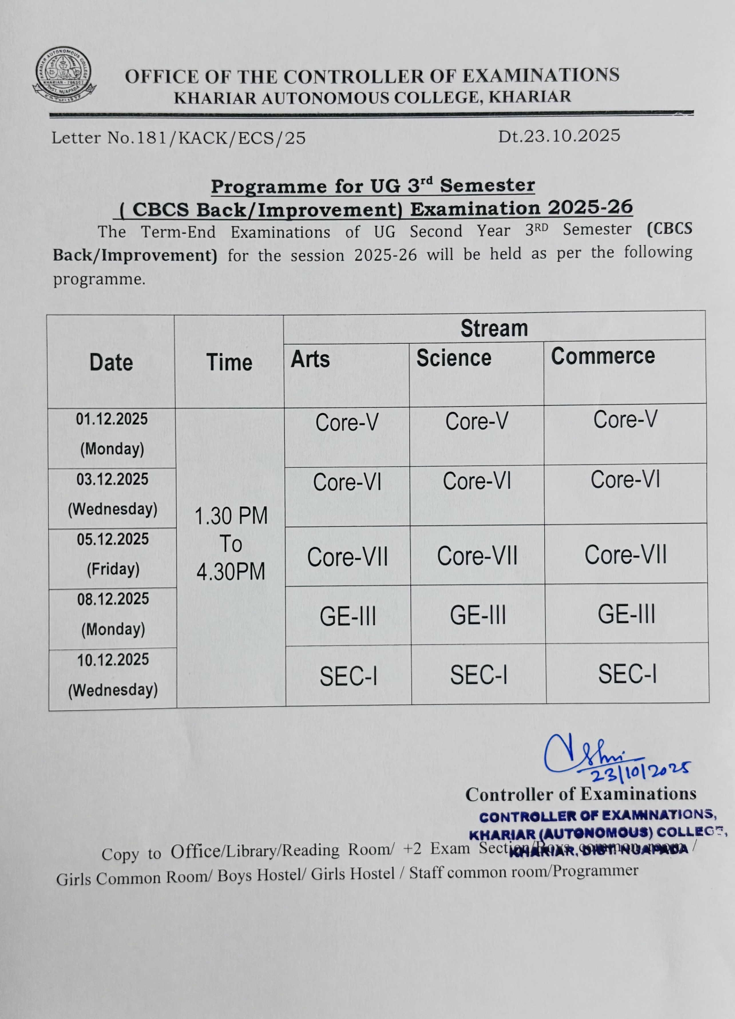 New26 October 2025UG CBCS-Back/Improvement 3rd Semester TEE
