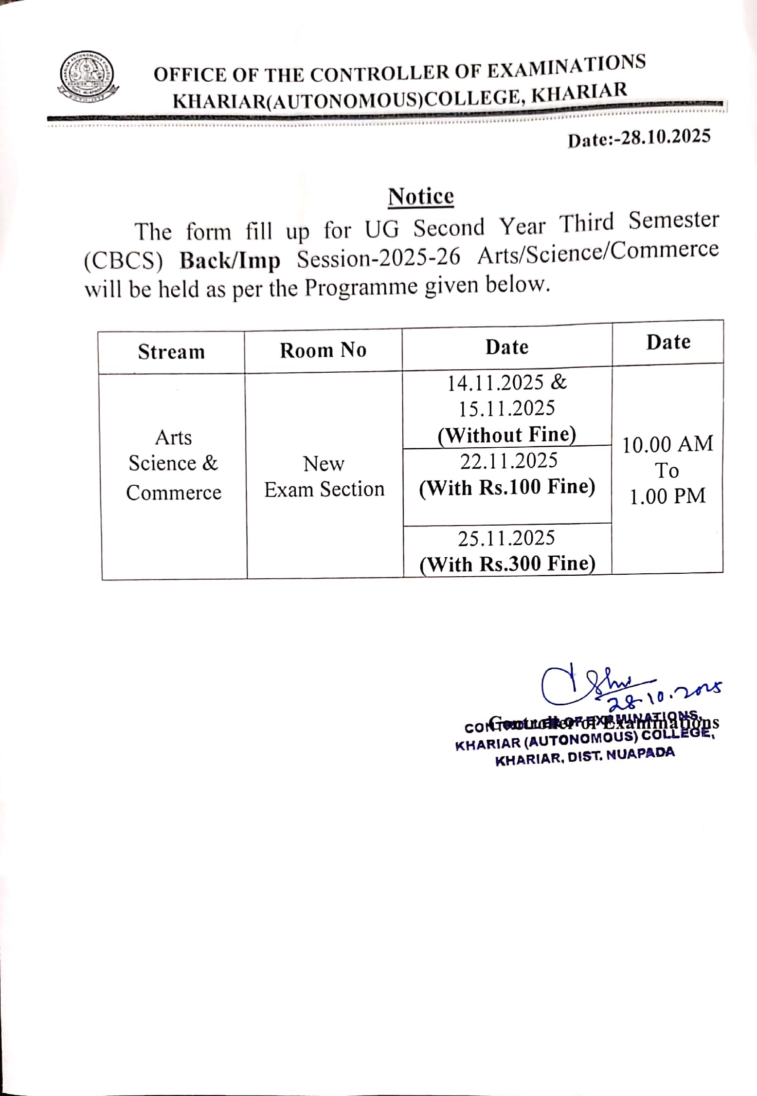 New28 October 2025UG 3rd semester Back/improvement (CBCS) form fill up